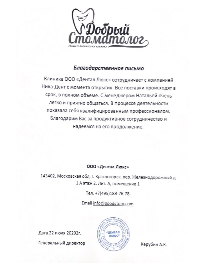 Все отзывыКлиника ООО "Дентал Люкс" сотрудничает с компанией Ника-Дент с момента открытия. Все поставки происходят в срок, в полном объеме. С менеджером Натальей очень легко и приятно общаться. В процессе деятельности показала себя квалифицированным профессионалом. Благодарим Вас за продуктивное сотрудничество и надеемся на его продолжение.