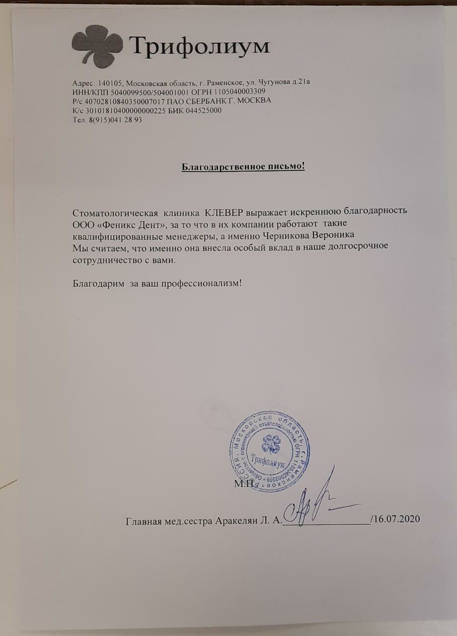 Стоматологическая клиника КЛЕВЕР выражает искреннюю благодарность Ника Дент, за то что в их компании работают такие квалифицированные менеджеры, а именно Черникова Вероника. Мы считаем, что именно она внесла особый вклад в наше долгосрочное сотрудничество с вами.