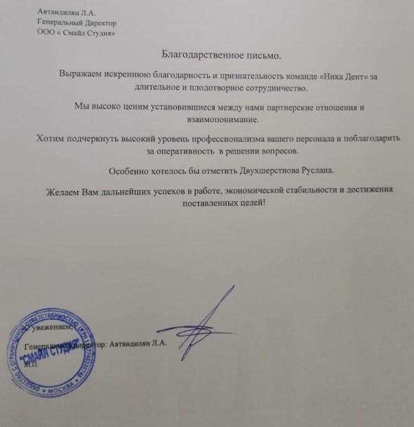 Выражаем искреннюю благодарность и признательность команде "Ника Дент" за длительное и плодотворное сотрудничество. Мы высоко ценим установившиеся между нами партнерские отношения и взаимопонимание. Хотим подчеркнуть высокий уровень профессионализма вашего персонала и поблагодарить за оперативность в решении вопросов. Особенно хотелось бы отметить Двухшерстнова Руслана. Желаем Вам дальнейших успехов в работе, экономической стабильности и достижения поставленных целей!