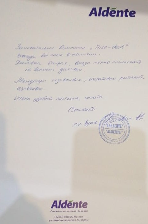 За время сотрудничества компания ГК "Ника-Дент" зарекомендовала себя как надежного партнера и ответственного поставщика стоматологических материалов. Хотим отметить оперативность поставок и реагирования на наши запросы, профессионализм и гибкий подход в работе ваших региональных менеджеров отдела продаж.
