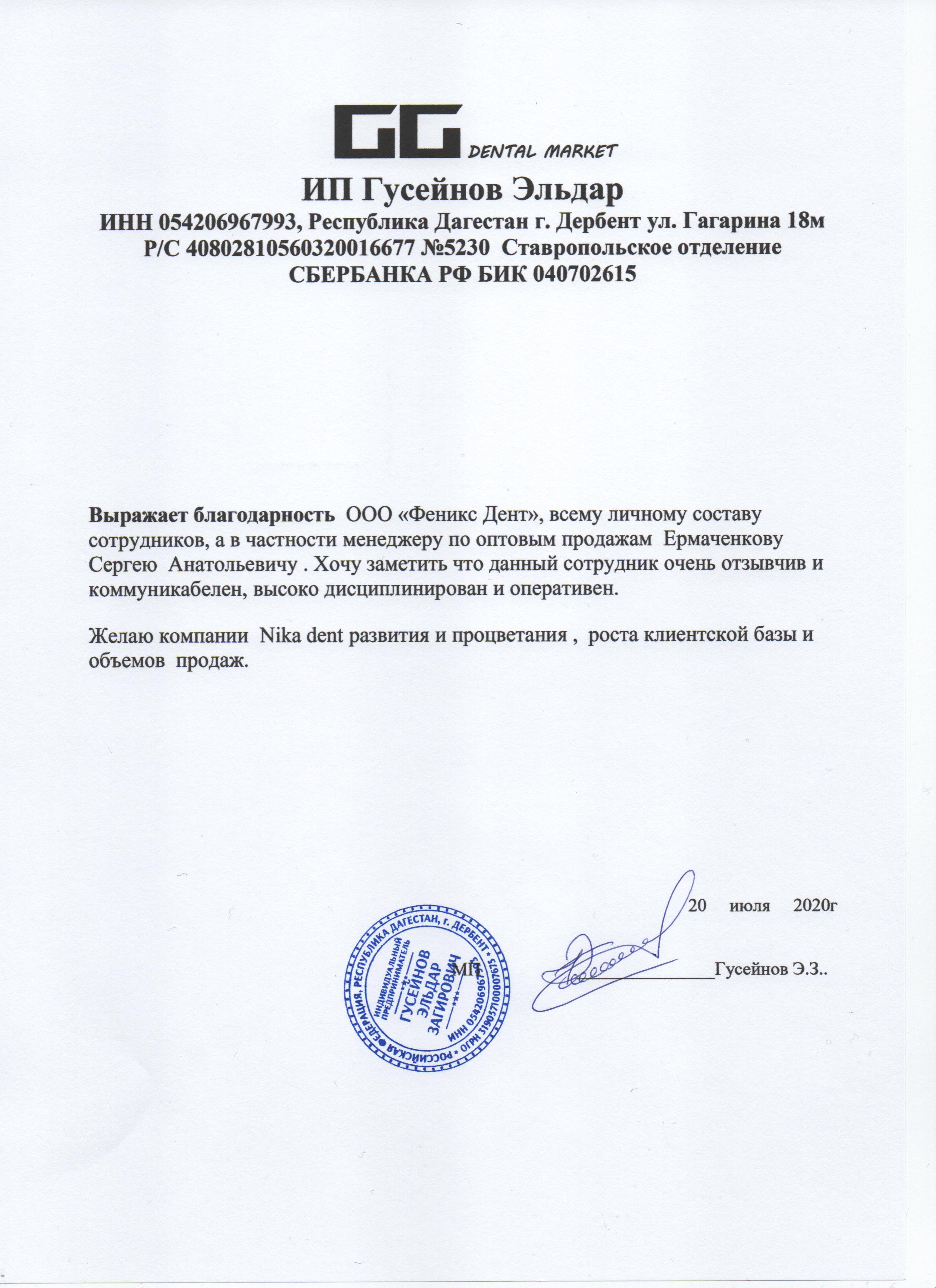 Выражаю благодарность "Ника Дент", всему личному составу сотрудников, а в частности менеджеру по оптовым продажам Ермаченкову Сергею Анатольевичу. Хочу заметить, что данный сотрудник очень отзывчив и коммуникабелен, высоко дисциплинирован и оперативен.