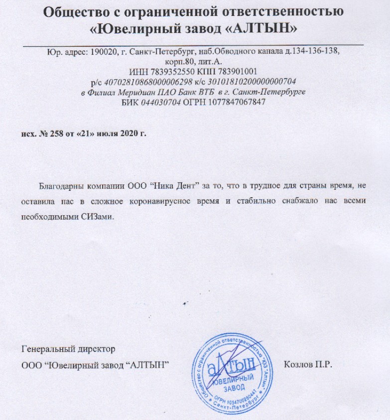 Благодарны компании ООО "Ника Дент" за то, что в трудное для страны время, не оставила нас в сложное коронавирусное время и стабильно снабжало нас всеми необходимыми СИЗами.
