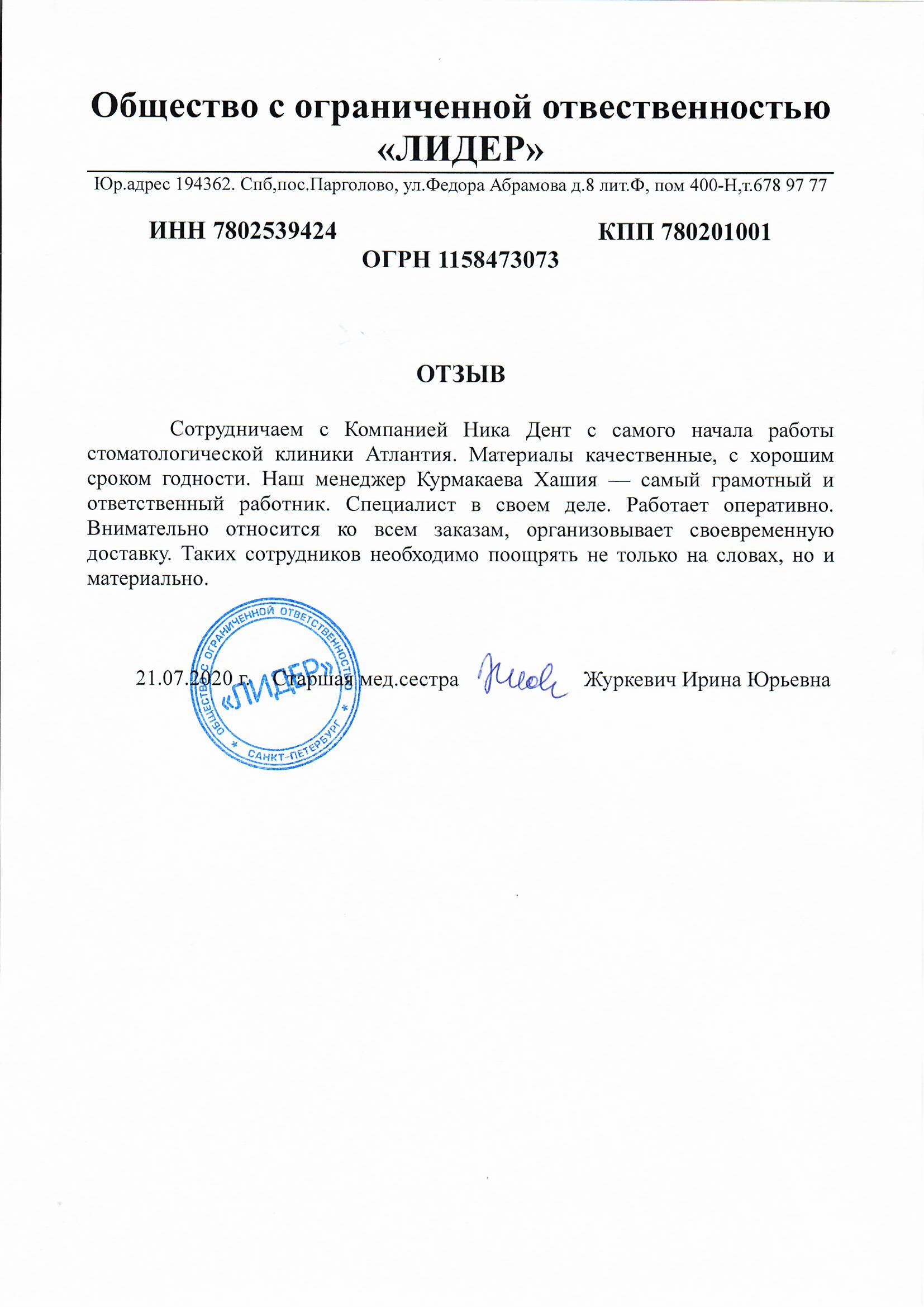 Сотрудничаем с компанией Ника Дент с самого начала работы стоматологической клиники Атлантия. материалы качественные, с хорошим сроком годности. Наш менеджер Курмакаева Хашия - самый грамотный и ответственный работник. Специалист в своем деле. Работает оперативно. Внимательно относится ко всем заказам, организовывает своевременную доставку. Таких сотрудников необходимо поощрять не только на словах, но и материально.