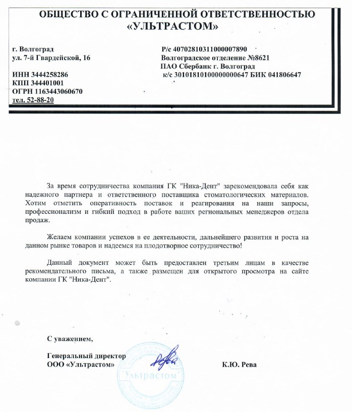 За время сотрудничества компания ГК "Ника-Дент" зарекомендовала себя как надежного партнера и ответственного поставщика стоматологических материалов. Хотим отметить оперативность поставок и реагирования на наши запросы, профессионализм и гибкий подход в работе ваших региональных менеджеров отдела продаж.