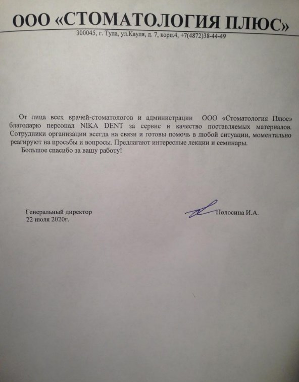 От лица всех врачей-стоматологов и администрации ООО "Стоматология Плюс" благодарю персонал NIKA DENT за сервис и качество поставляемых материалов. Сотрудники организации всегда на связи и готовы помочь в любой ситуации, моментально реагируют на просьбы и вопросы. Предлагают интересные лекции и семинары. Большое спасибо за вашу работу!