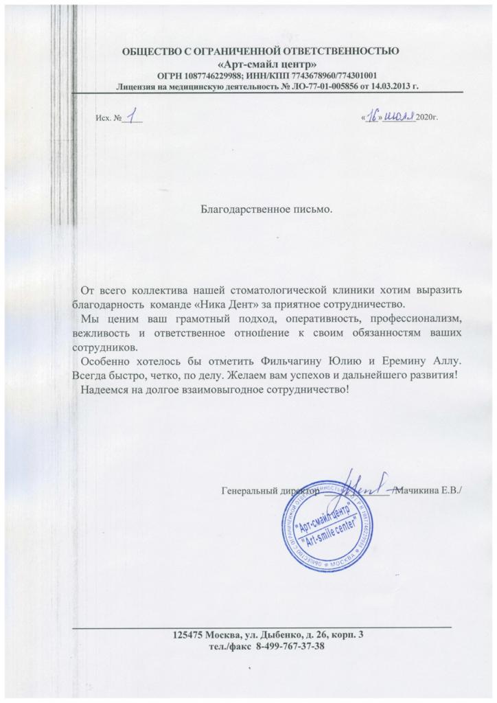 От всего коллектива нашей стоматологической клиники хотим выразить благодарность команде "Ника Дент" за приятное сотрудничество. Мы ценим ваш грамотный подход, оперативность, профессионализм, вежливость и ответственное отношение к своим обязанностям ваших сотрудников.